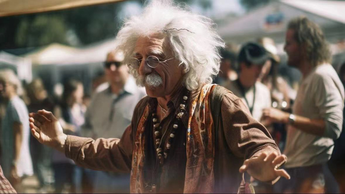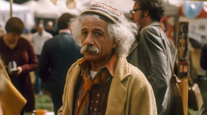 图中,在卡塔尔世界杯上,中国国家足球队欢呼雀跃,在绿茵场上捧起了大力神杯。与国足夺冠同步走红的,还有马斯克穿越苏联工厂、爱因斯坦在音乐节狂欢等等“神图”。