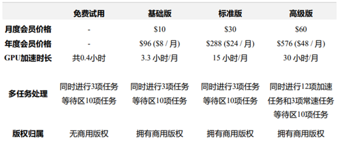 2022年8月份,创始人Holz表示Midjourney已经实现盈利。目前Midjourney的商业模式为面向C端用户的Freemium模式。新用户可以免费生成25张照片,之后按照订阅制收费。月付制为10、30、60美元,或者使用年付制,价格为8、24、48美元/月。只有付费用户才拥有使用Midjourney生成图片的商业版权。