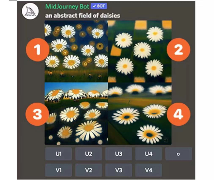 输入完成后,Midjourney将自动生成四张图,用户能够选择其中一张继续优化,比如进行变形、更改尺寸、细节优化等操作。