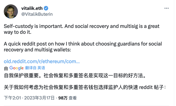 以太坊联合创始人Vitalik Buterin3月曾发文称,自托管非常重要,社交恢复和多重签名是实现这一目标的好方法。并表示在加密支付方面使用 ERC-4337 账户抽象钱包会更加便利。
