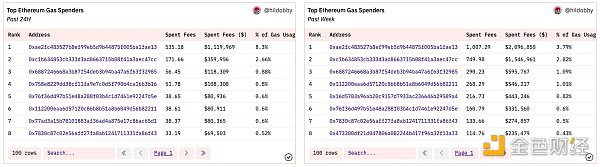 Dune Analytics(主页:Ethereum Gas)数据显示,在过去 24 小时内,jaredfromsubway.eth(图中 0x ae 2 开头地址)仅 gas 就消耗了 535.18 ETH(这么看单笔消耗约 0.01 ETH),价值约 1119969 美元,占全网数据的 8.3% ;而在过去一周内,该地址更是消耗了 1007.29 ETH,价值约 2096850 美元,占全网数据的 3.79% 。