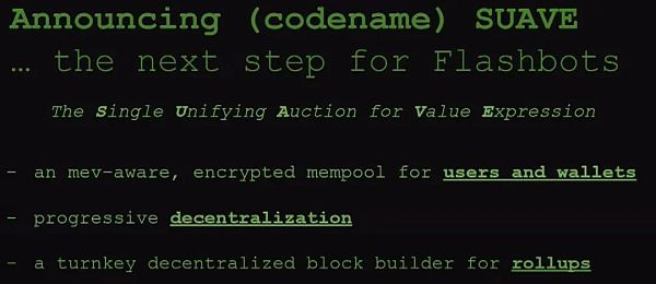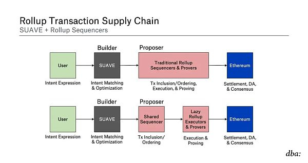 当我们讨论这些试图为许多其他链处理交易的共享层时,这里的差异可能会变得非常令人困惑。特别是 SUAVE 作为 “排序层 (sequencing layer)” 这一组件经常和其他术语一块出现,比如还有另一个组件是 “针对 rollup 的去中心化区块构建者”。需要明确的是 —— SUAVE 与上面描述的共享定序器设计非常不同。