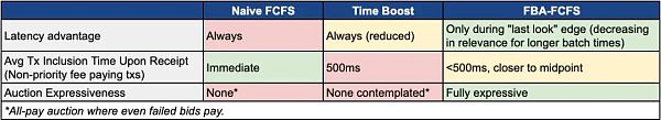 FBA-FCFS 带来更多的可变性 (例如,交易可能会根据接收时间滑到下一个 batch),但不支付优先打包费的常规用户交易的平均打包时间应该更低。在 Time Boost 模型中,时间是连续的 (没有区块的概念),而在 FBA-FCFS 模型中,时间是离散的。总的来说: