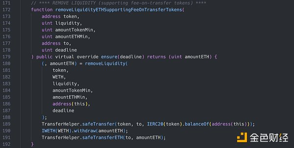 通过分析 Uniswap V2 Router 02 合约的代码,发现存在 removeLiquidityETHSupportingFeeOnTransferTokens 函数: