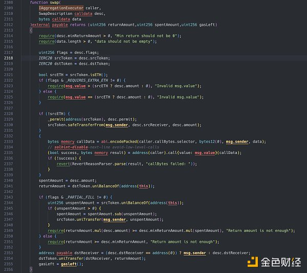 AggregationRouterV 5 合约存在 swap 函数,其实现如下: