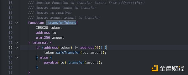 首先将传入 cook 函数的 data 进行解码,然后判断 amount 是否等于 0 ,等于 0 则将 amount 的值设为该合约的 ERC 20 代币的余额或者 ETH 的余额。最后调用 _transferTokens 将代币转移到指定的地址: