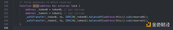 可以看到该函数会将流动性池中两种流动性代币的 balance 和 reserve 差值数量的代币转移到 to 地址。