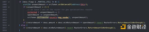 然后获取合约中 dstToken 的余额。1007-1018 行我们可以构造 desc 中 flags 以及 minReturnAmount 进行绕过: