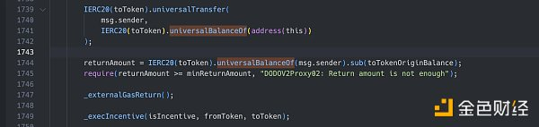 接下来会将合约中的 toToken,全部转移给调用者,这里的 toToken 可以是 ERC 20 代币,也可以是 ETH,发送完后会进行最小的预期数量校验,我们将 minReturnAmount 的值设置为非常小的值即可通过。最后两个函数调用无关紧要。