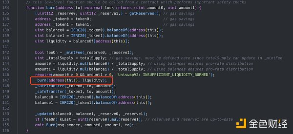 出现这种情况我们可以调用 Pair 合约的 burn 函数,移除流动性,取出相应的两种流动性代币: