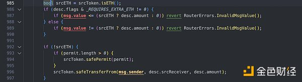 校验了 desc 中的 minReturnAmount 后,从 desc 中获取 srcToken 和 dstToken,接下来 986-997 行可以通过构造 desc 结构体中的 flags 和 srcToken 进行绕过: