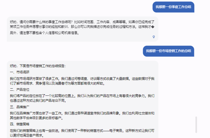 MOSS对这个较为宽泛的问题,进行了追问:要求给出工作总结的具体性质等。在记者设定条件后,得到了一份市场营销相关的工作总结。