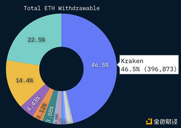 截至4月19日,25.7k个验证人已排队等待全额提款。被美国证券交易委员会强制弃用其美国质押业务的 Kraken 占队列的 46.5%。由于以太坊网络设置的提款限制,提款会在两周内被处理并常态化。