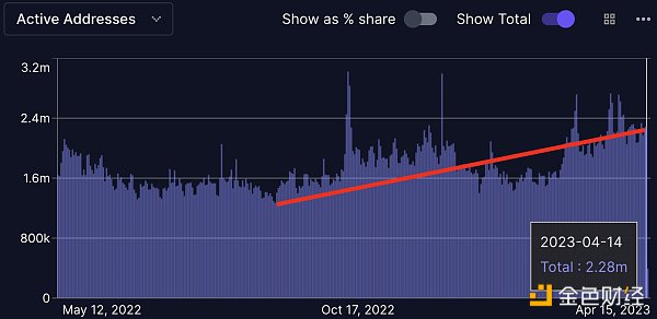 尽管宏观经济学家们在争论潜在经济衰退的利弊,但区块链经济一直在繁荣。主要的智能合约区块链的每日活跃总地址一直稳定在200万,这是自2022年牛市结束以来未见的壮举,自2022年8月下旬触底以来增加了77%。