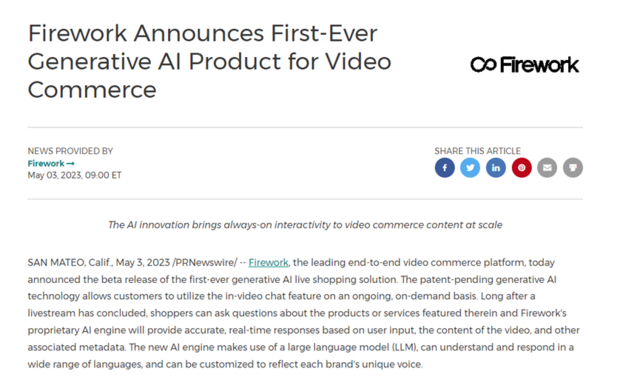 美东时间5月3日,美通社消息,视频技术服务平台Firework,宣布推出首个用于视频直播服务的类ChatGPT生成式AI产品,以帮助播主提升商业化转化率和客户体验。