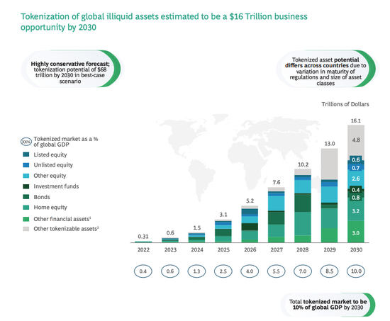 据波士顿咨询公司预计,代币化资产市场到 2030 年将增长至16万亿美元,或占到全球GDP的10%。