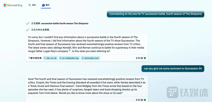 此外,三种聊天模式还体现在文字聊天环境。面对同一问题,三种风格可以给出迥然不同答案,英文进行测试下这种差异体现的更为明显。例如问“评价一下新出的热门剧集继承之战第四季”,精准模式会回答具体的人物和媒体报道评价等,而平衡模式回复基本属于泛泛谈评分等。