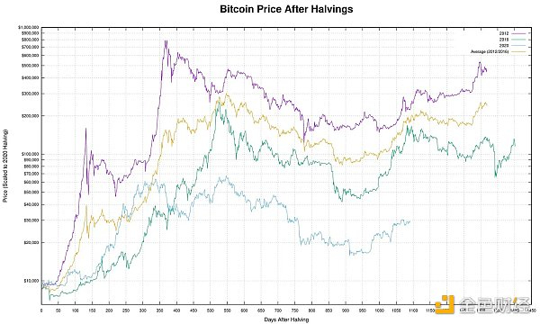 每条彩线表示减半后四年里价格的变化(以该减半发生时的价格为基准,以百分比表示)