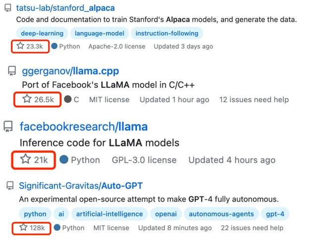 确实,开发者对开源的AI模型前所未有的热情正在从Github的打星量指标中溢出:Alpaca获得了23.2k星,llama.cpp获26.3k星,LLaMA获20.8k星……而在“羊驼家族”之前,AutoGPT等开源项目也在Github拥有超高的人气,突破100k星。