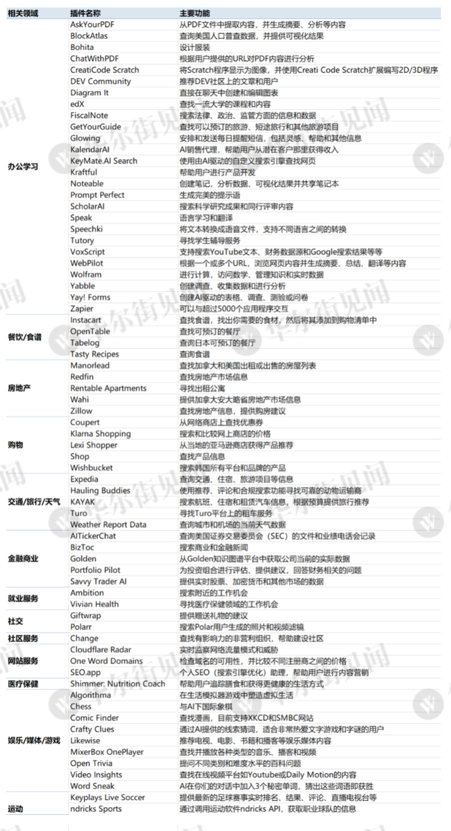 根据华尔街见闻的梳理,本批第三方插件能够全方位覆盖衣食住行、社交、工作以及学习等日常所需,基本上能够扮演24小时私人助理的角色。
