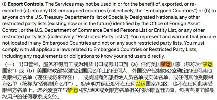 让我们把视野看到OpenAI,会发现对于清理用户数据的条款要友好很多,不过我们也发现了一些极具美国特色的条款,比如说所谓的“实体名单”