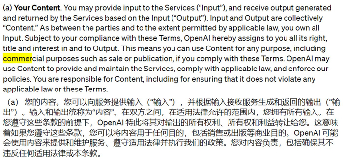 相比之下,OpenAI则体现了对客户的一种温情:它明确将用户生成的内容的所有权利、所有权和利益转让给客户。
