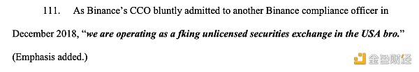 证监会在诉讼文件中甚至加粗引用了币安CCO的非正式原话,“老弟,我们就是在美国运营一家的 TM 的未注册交易所啊。”