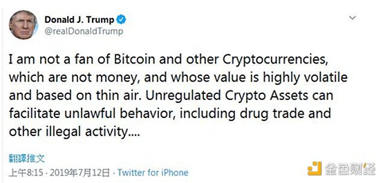 2019年7月,特朗普曾发推表明自己对比特币及其他加密货币的态度:“我不喜欢比特币和其他加密货币,它们不是金钱,而且其价值高度不稳定且基于稀薄的空气。不受监管的加密资产可能会助长非法行为,包括毒品交易和其他非法活动……”