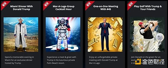 或许是为了加强炒作效果,官网还推出了抽奖活动:每购买一个NFT,就可以有抽奖资格,与特朗普共进晚宴、与特朗普一起打高尔夫球、获得特朗普签名照……“超人特朗普”、“太空人特朗普”、“球员特朗普”等角色都被包括在NFT系列形象中,可以极大的满足不同粉丝的口味。