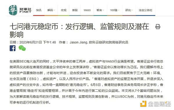 由于稳定币在数字金融生态中扮演的重要角色与巨大潜力,香港业界开始畅想港元稳定币的发展前景。7 月 3 日,多位关注香港 Web 3 的专家学者在《大公报》发表联合署名文章,强烈提议香港特区政府发行以香港外汇储备为背书的港元稳定币,以促进金融科技创新,提升金融市场竞争力,使香港在数字经济时代中保持竞争优势。而欧科云链研究院此前在 6 月底也曾在大中华区最知名的财经媒体财华社发表题为《七问港元稳定币:发行逻辑、监管规则及潜在影响》的专题文章,与各界分享对港元稳定币的观察与思考。