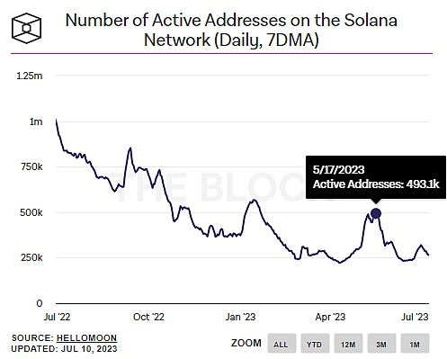 另外,根据相关数据,5 月,Solana 日活地址数最高达到了 49 万,该数据几乎与去年 11 月 11 日 FTX 正式申请破产时的 50 万日活地址数相当。