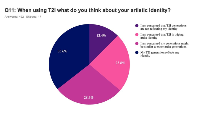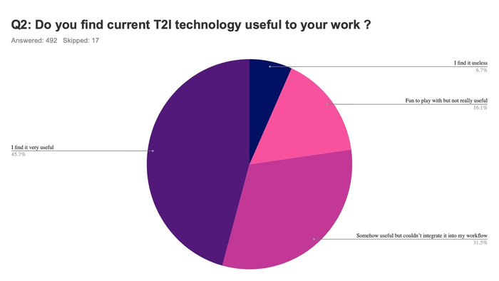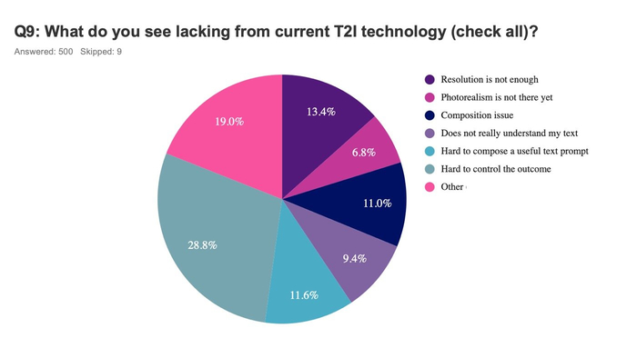 此外,艺术家们还对AI有着各种各样的批评。例如,仅有3成艺术家认为AI画图的版权不存在问题,而过半艺术家认为依然有版权隐忧。艺术家们还不满称,眼下的AI模型依然很难对最终产出进行精准控制,AI生成的分辨率与细节控制也无法满足他们的需求。