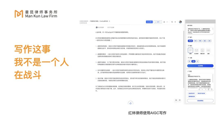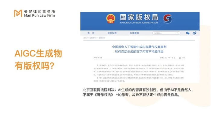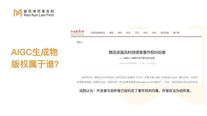 案例1:2018年,北京一家律师事务所起诉了一家公司。起诉原因是这家律师事务所通过大数据检索的方式生成了案件检索报告,某公司未经其同意而使用,该律所认为公司的行为侵犯了他们的知识产权。北京互联网法院判决的观点是:AI不是真正的人,不属于中国著作法上的作者,所以不能认为AI生成的内容是作品。