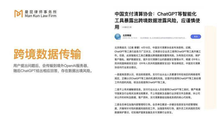 根据ChatGPT的使用规则来看, 我们作为一个用户在前端输入的所有信息先会回传到ChatGPT在美国的服务器,然后美国服务器会再把相应的信息回传回来。在这个过程中,中国一些核心的数据有可能会作为ChatGPT的用户数据直接流传到境外。
