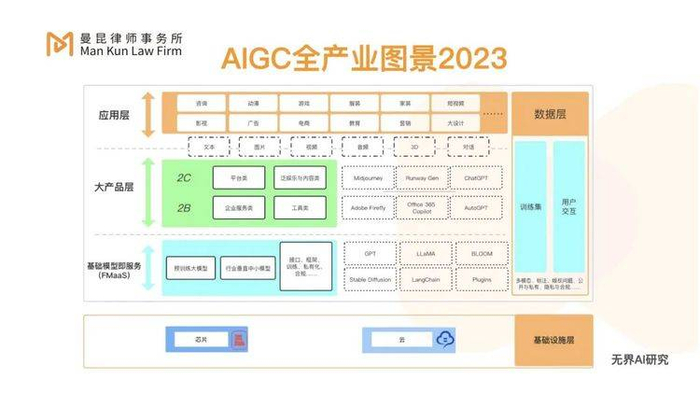 AIGC这个产业链中有三个角色:第一个角色是中间主人公:AI产品;第二个角色是左侧AIGC的技术服务方;第三个角色是右侧的产品用户。