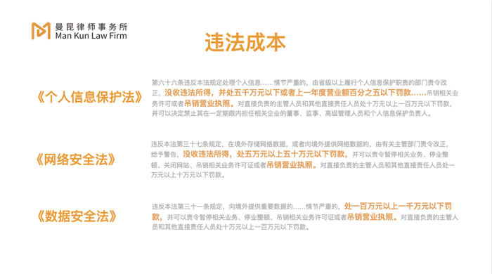 违反数据安全,无论是数据跨境出海,还是没有保管好用户的数据,或者是过度获取用户的一些数据权限,成本都比较高,我这边也很贴心的为大家考虑了违法成本: