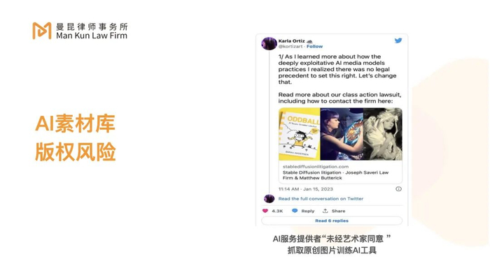 国外案例:华盖创意公司起诉了一个AIGC绘图软件,称其数据库里面大概有近500张作品的原素材没有经过其同意,就使用这些东西作为训练素材,涉嫌侵权。