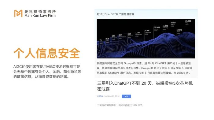 普通用户或许没有很强的隐私或者信息安全意识,但是对信息比较敏感的行业,比如说金融行业、保险行业、一些政府单位,信息安全就非常重要,在使用ChatGPT的过程中很容易出现个人信息泄露的问题。2023年4月份的时候,中国支付清算协会专门发布了一个通知,提示ChatGPT有泄露国家机密或者行业机密的风险。