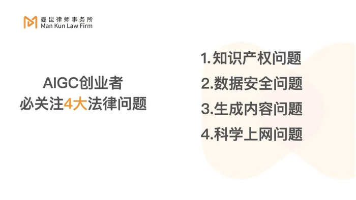 我们来聊聊关于AIGC的核心法律问题,下图是我对AIGC在创业过程中可能遇到的问题进行的提炼。
