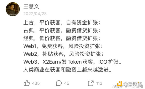 美团联合创始人王慧文曾锐评 web 3 有着更激进的获客和融资模式,而 Token 是实现这一模式的工具。老项目开展新业务陷入往往两难之中,如果大量增发代币激励新项目,将会面临价格下跌,而不这么做的话很难在竞争中获胜。
