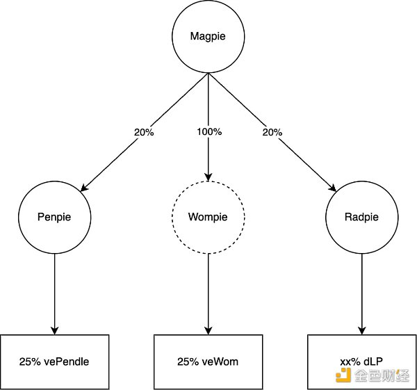 以 Magpie 的 subDAO, Radiant 的 yield booster Radpie 为例。Radpie 将发行 $RDP,其中 Magpie 国库持有 20% ,此外 30% 的 IDO 份额也会给到 MGP,这意味着