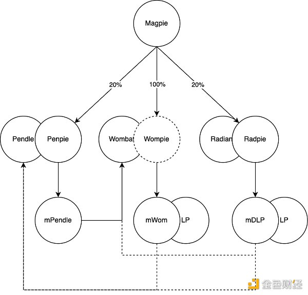 以 Magpie 为例,名义上 Magpie 控制了 20% Penpie 的治理权,Penpie 又控制了 25% Pendle 的治理权。从一方面讲,Magpie 享有 20% x 25% = 5% vePendle 的各项收益,但从另一方面讲;对于 协议治理, yes or no 这类问题, 20% 的 Magpie 的投票将会很大程度上决定 Penpie 的投票,也就是说其实是有近乎 25% 的 Pendle 治理权。
