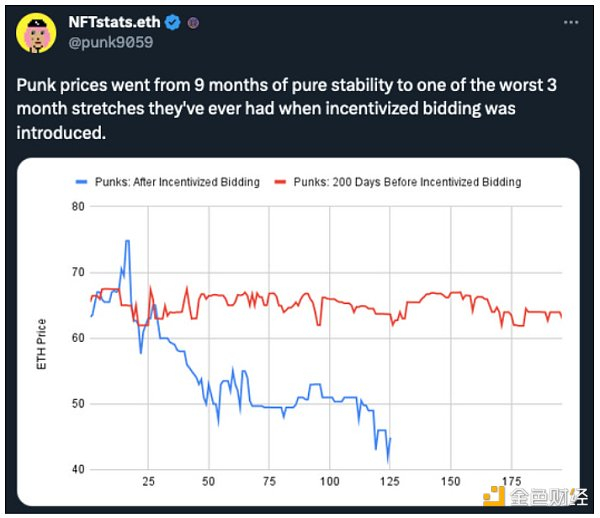 随着这个过程的展开,吸引许多人进入 PFP 市场的早期功能(特征识别、购买值得拍照的 NFT、进入社区)被侵蚀,变得不再有吸引力。 自 Blur 推出代币激励措施以来,PFP 价格一直在下跌,图表:NFT 统计