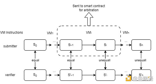 提交者和验证者将首先使用二分协议启动第二阶段的验证游戏, 以定位“大指令”上的争议步骤。此步骤将发送到下一阶段,即phase -1。第一阶段的工作原理类似于单阶段验证游戏。第一阶段的二分协议将有助于定位 VM 微指令上的争议步骤。该步骤将发送至区块链上的仲裁合约。