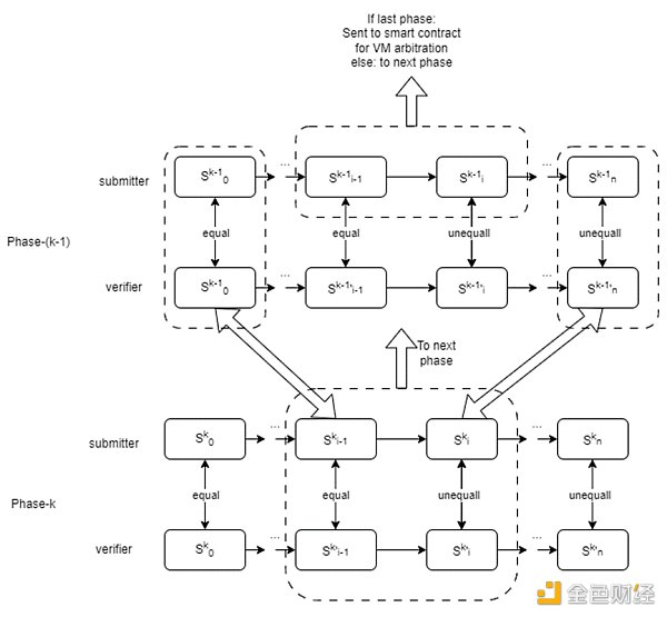 下图演示了一个验证游戏由两个阶段(k = 2)组成。在阶段1中,该过程类似于一个单阶段验证游戏,其中每个状态转换对应于一个改变虚拟机状态的单个VM微指令。在阶段2中,状态转换对应于包含改变计算上下文的多个微指令的“大指令”。