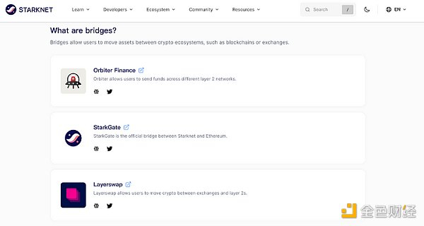 StarkNET 官网推荐了 Orbiter 跨链桥,而且是排名第一位的推荐。