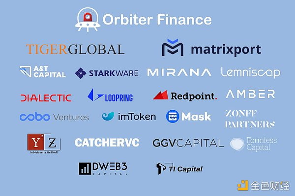 Orbiter 于 2022 年 11 月完成首轮融资,Tiger Global、Matrixport、A&T Capital、StarkWare、Cobo、imToken、Mask Network、Zonff Partners 等参投,但融资金额并未披露。