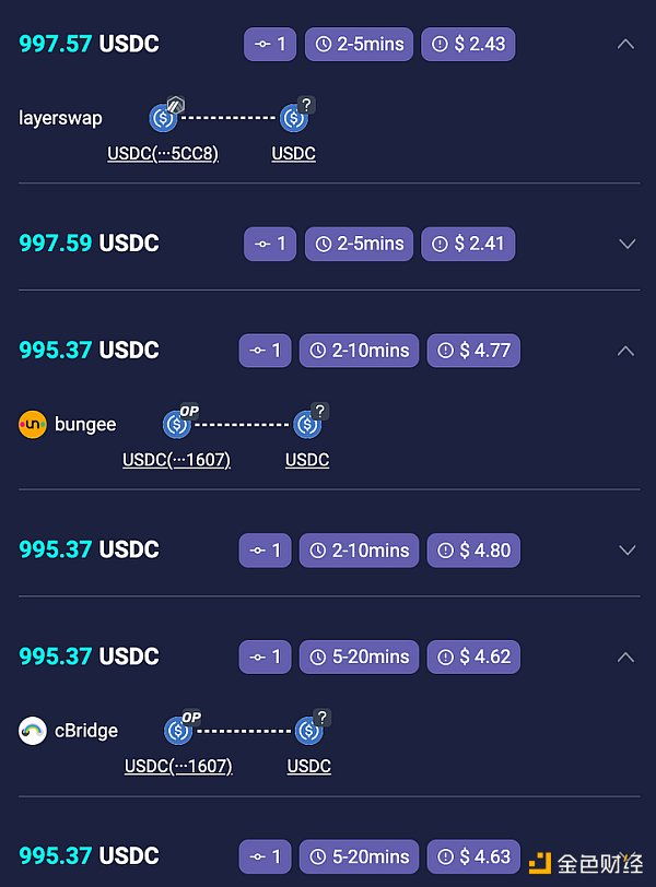 假如我们从 OP 链/ARB 链上转 1000USDC 到 ZK 链,看看这些跨链桥的费用以及速度: