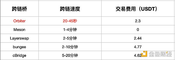 可以看到,Orbiter 的速度是最快的,基本上在 20–45 秒内就可以完成跨链,而排名第二的是 Meson 则需要 1–4 分钟的时间。
