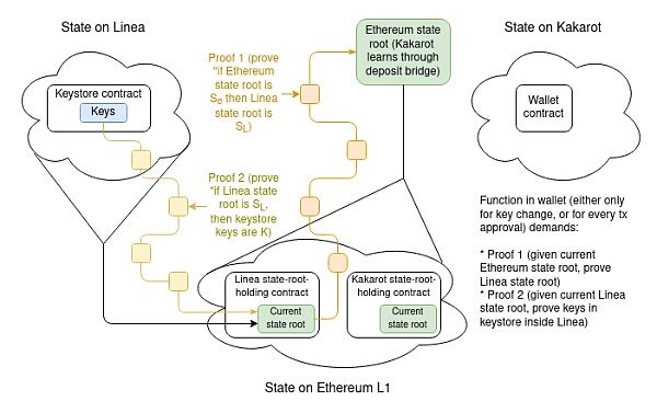 假设密钥库在 Linea 上,钱包在 Kakarot 上。钱包密钥的完整证明过程则需要包括:
